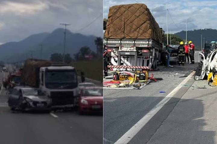 Um engavetamento envolvendo sete carros e um caminhão carregado com frutas foi registrado na tarde deste domingo (16) na BR-470, nas proximidades do viaduto de acesso ao Bairro Carijós, em Indaial.