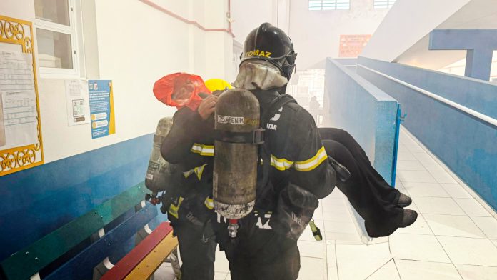 As equipes do Corpo de Bombeiros simularam a evacuação, a busca e a retirada de vítimas. “Trabalhamos a ordenação de aproximadamente 350 alunos, em parceria com os profissionais da escola, que saíram do local de maneira organizada e segura em cerca de dois minutos”, destaca o Sargento Herkert, da OBM de Penha.