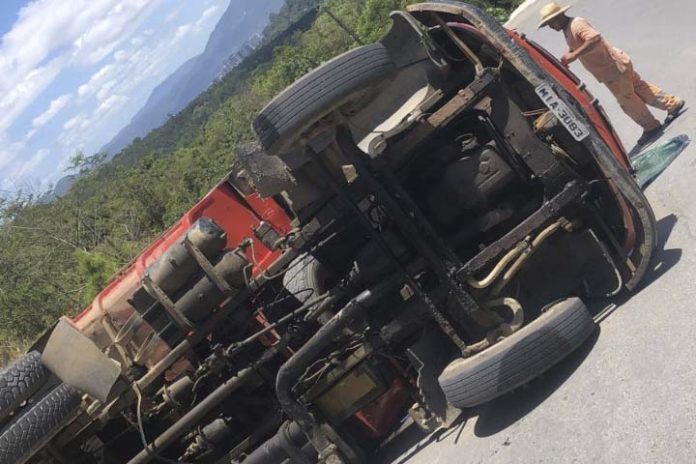 Um caminhão tombou na descida do Morro de Zimbros, em Bombinhas. O acidente foi nesta sexta-feira, por volta das 11h50.