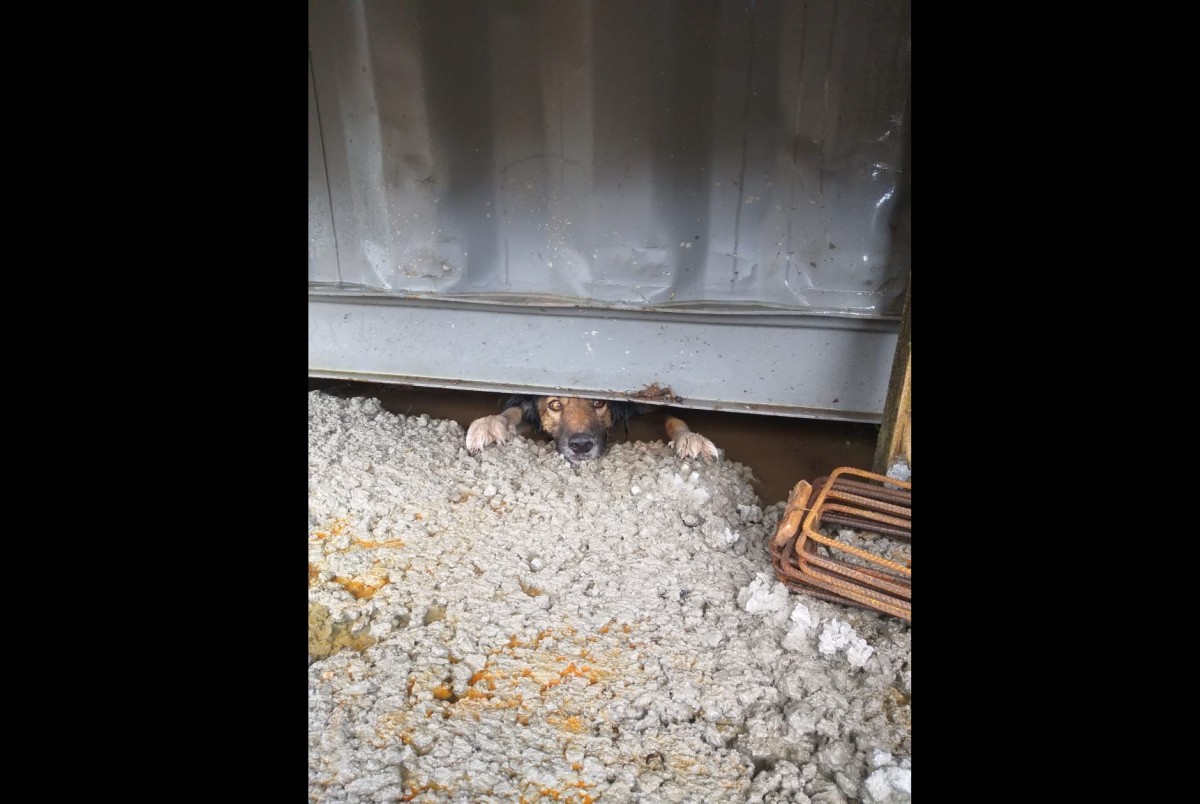O cão foi encontrado em um local alagado e só foi possível resgatá-lo com o uso da força. A equipe de bombeiros precisou do auxílio de um martelete rompedor, emprestado por moradores do local, para acessar o piso próximo ao container e retirar o animal.