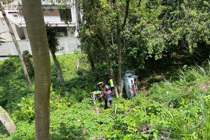 Uma mulher foi socorrida após o capotamento e queda do carro em uma ribanceira na Rua Teresa Francisca Pereira, na Praia de Cabeçudas, em Itajaí. O acidente foi por volta das 13h30 desta segunda-feira (14).
