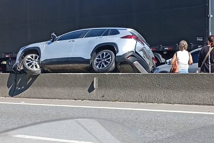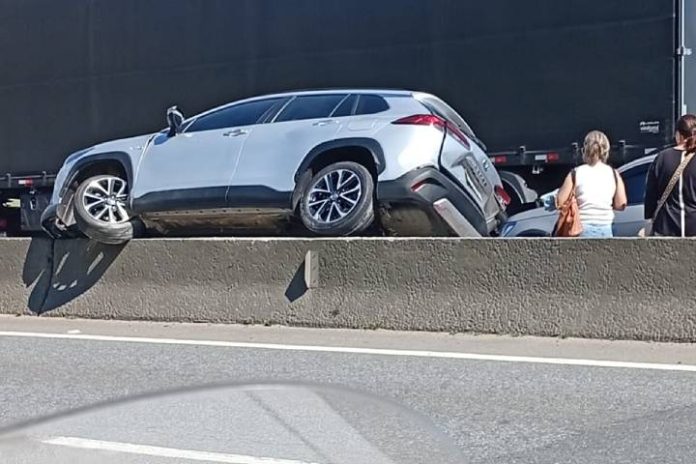 Um dos veículos acabou indo parar em cima da mureta de proteção da rodovia. Os prejuízos foram apenas materiais.