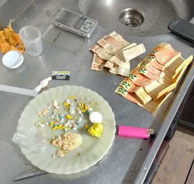 Após buscas, foram encontradas 30 gramas de crack, 10 gramas de cocaína, 6 comprimidos de ecstasy, uma balança de precisão e R$ 290,00 em dinheiro.