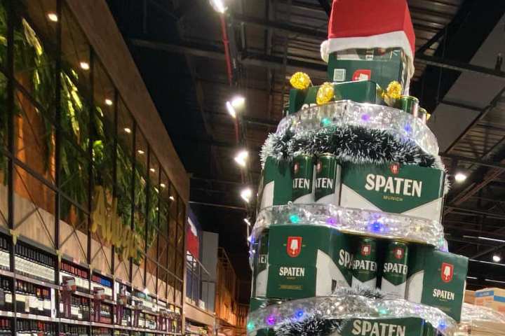As caixas de Spaten formam a árvore de natal montada especialmente para quem gosta de cerveja.