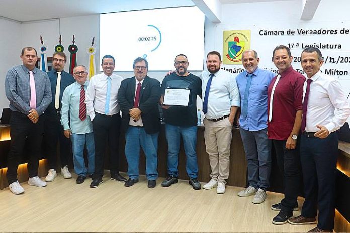 A honraria, oficializada por meio da Moção nº 8/2026, foi proposta pelo vereador Osmauro Fassbinder (PL), conhecido como professor Zaca.