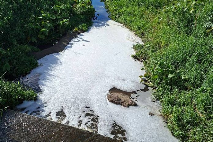 Imagens registradas no local mostram a água coberta por uma espessa camada de espuma branca, além de resíduos escuros escorrendo pela sarjeta, o que levanta suspeitas de possível descarte irregular de esgoto ou substâncias poluentes.