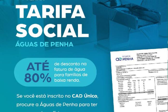 A Tarifa Social da Águas de Penha é um benefício concedido a moradores de baixa renda, permitindo com que as famílias cheguem a pagar até um quarto do valor total da tarifa.