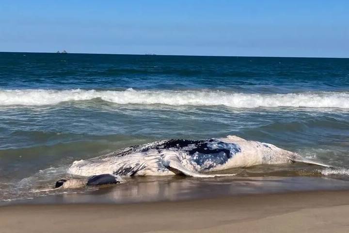 Uma moradora contou que o corpo da baleia chegou a ser acompanhado por golfinhos no mar antes de encalhar na praia — uma cena impressionante e ao mesmo tempo triste para quem presenciou.