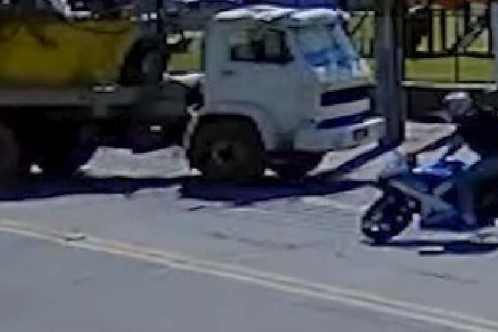 No vídeo é possível ver que o caminhão carregado de entulhos transitava no sentido centro/bairro. Em um determinado momento, o motorista tenta convergir na pista e entrar em um posto de gasolina. Neste momento, o motociclista aparece nas imagens. Ele tentou frear, mas colidiu com a lateral do caminhão.