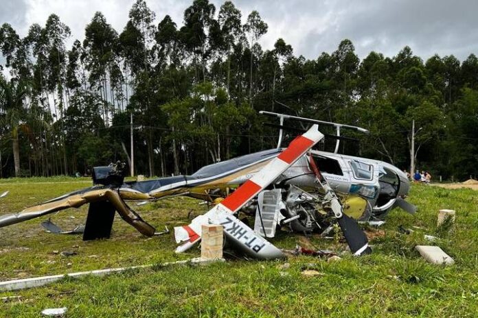 Um helicóptero com cinco pessoas caiu neste sábado, 4, em Penha. Todas foram resgatadas com vida e duas se feriram no acidente.