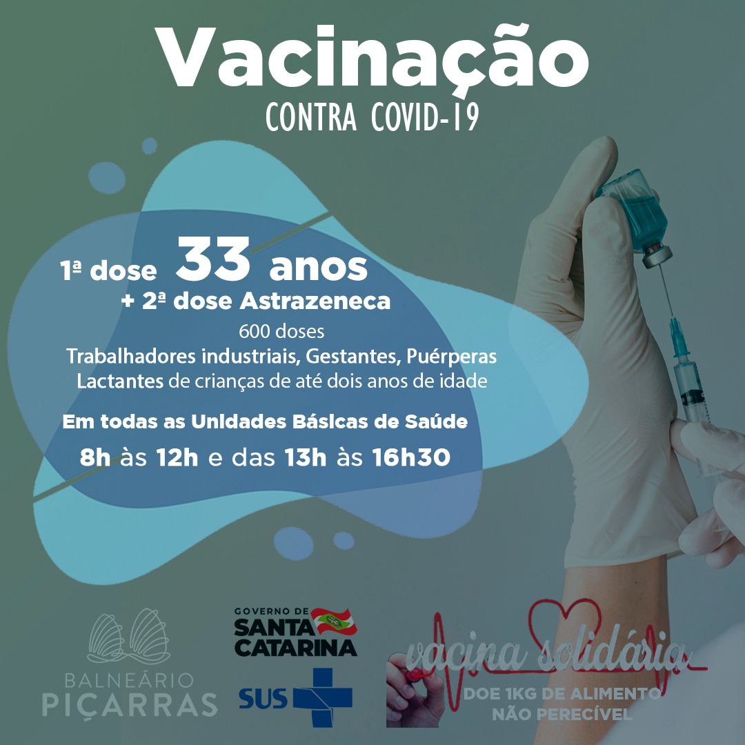 WhatsApp Image 2021 08 10 at 15.09.49A Secretaria Municipal de Saúde de Balneário Piçarras permanece de plantão até às 19h  para distribuir doses da vacina contra Covid 19 em pessoas com 33 anos e mais. A imunização ocorre nas unidades de saúde do Santo Antônio e do Nossa Senhora da Paz.