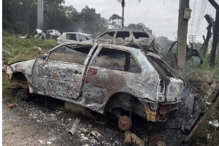 Um ferro velho localizado às margens da BR-101, em Barra Velho, teve cerca de 15 carcaças de carro incendiadas na tarde deste domingo (11).