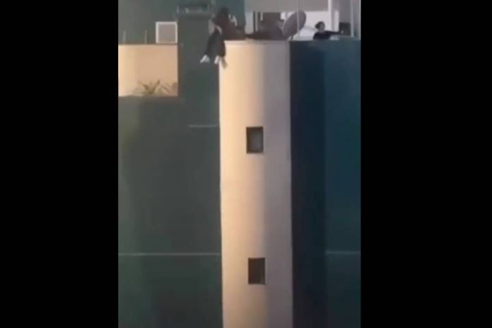 Um vídeo que circula nas redes sociais nesta quarta-feira (9) mostra uma jovem sentada perigosamente à beira do terraço de um edifício em Balneário Camboriú.