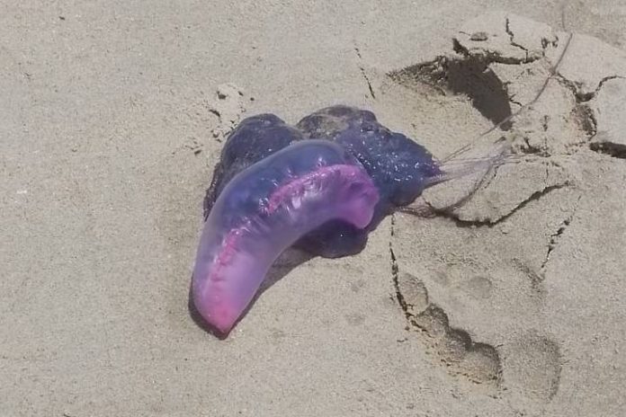 A espécie registrada é conhecida como Physalia physalis, popularmente chamada de caravela-portuguesa, que pode provocar queimaduras dolorosas ao contato com os tentáculos.