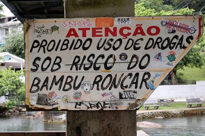 Uma placa colocada no canal da Barra da Lagoa chama a atenção. Ela ameaça os usuários de drogas com os dizeres “proibido uso de drogas sob risco do bambu roncar” .