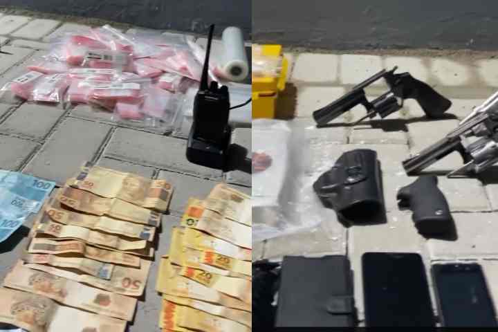 No local foram encontrados mais de 2 quilos de substância semelhante à cocaína, além de três armas de fogo ilegais, materiais para preparação da droga para vendas, acessórios de armas de fogo, dinheiro em espécie, máquina de cartão, rádios de comunicação, várias anotações referentes ao tráfico e três aparelhos celulares.