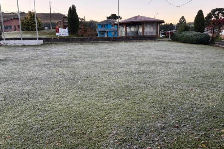Logo atrás aparece Urupema, conhecida como a cidade mais fria do Brasil, com -2,24°C e forte formação de geada no amanhecer. Outras cidades da Serra também enfrentaram frio intenso: