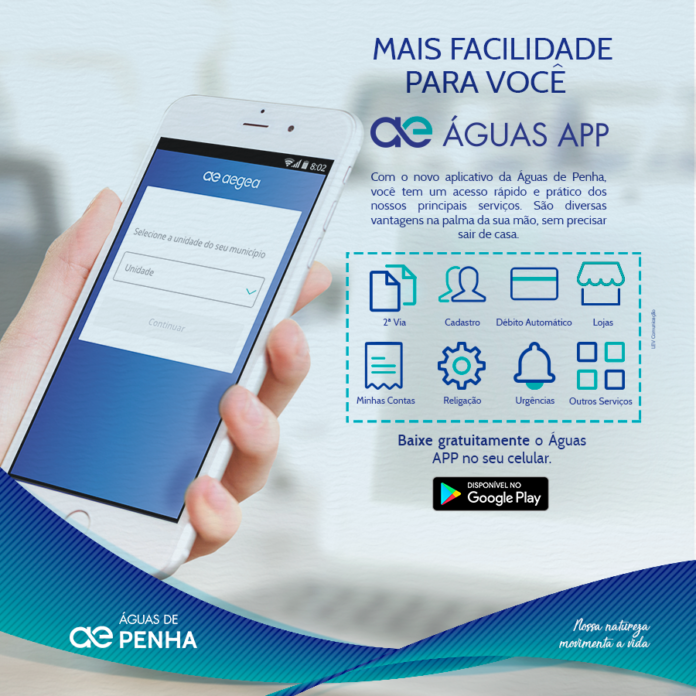 Muitos dos serviços oferecidos pela Águas de Penha podem ser acessados de forma rápida e fácil, na palma da mão, por meio do aplicativo Águas APP. A ferramenta possibilita, por exemplo, solicitação de religação de água, acesso à 2ª via da fatura e ao cronograma de leitura. O cliente também pode informar sobre vazamentos e fazer denúncias.