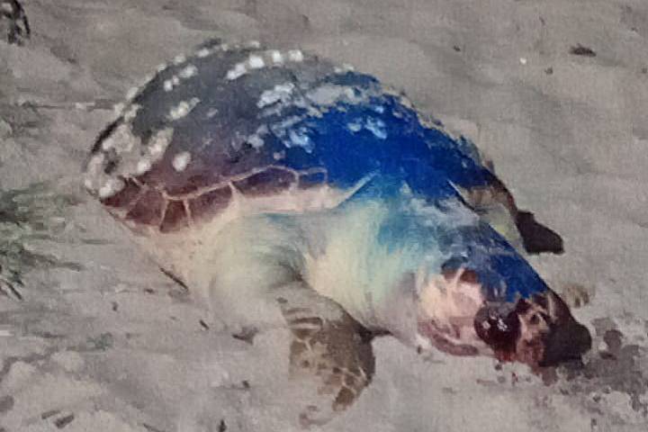 De acordo com o relato, a tartaruga não estava na beira da água, mas posicionada perto da vegetação de restinga, o que levanta a suspeita de que o animal possa ter sido retirado do mar e colocado ali posteriormente.