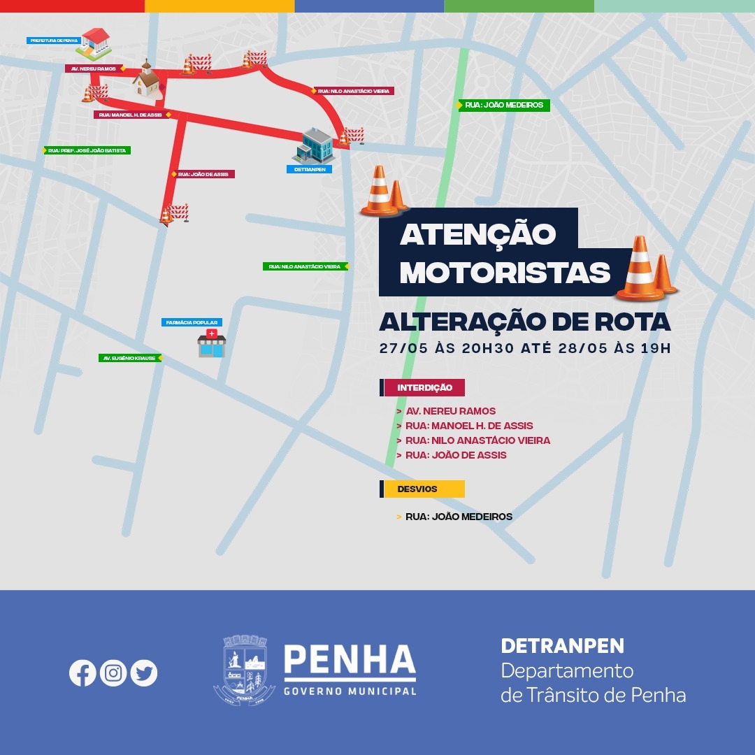Devido a realização da Festa do Divino, a Paróquia Nossa Senhora da Penha solicitou ao Departamento de Trânsito (DetranPen) o desvio temporário do trânsito neste sábado (27), às 20h30, até domingo (28), às 19h.