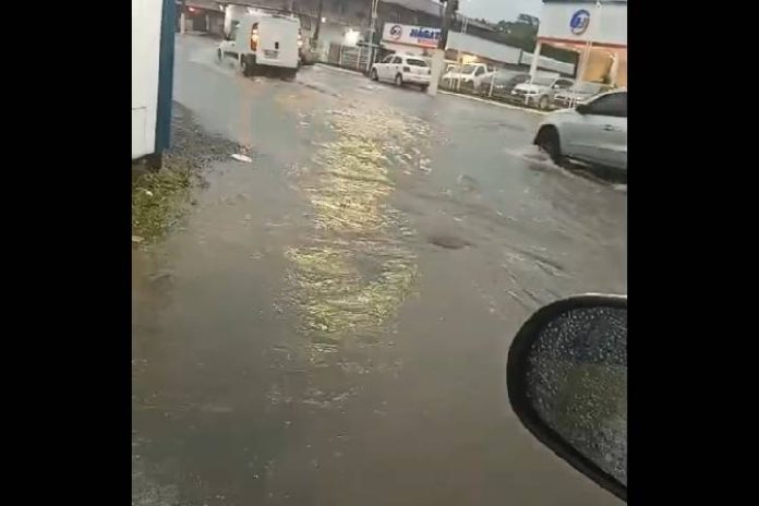 Vídeos enviados por motoristas mostram carros avançando lentamente em meio à água acumulada, motociclistas buscando rotas alternativas e pedestres tentando se proteger da enxurrada. Em alguns pontos, a lâmina d’água cobriu boa parte das rodas dos veículos.