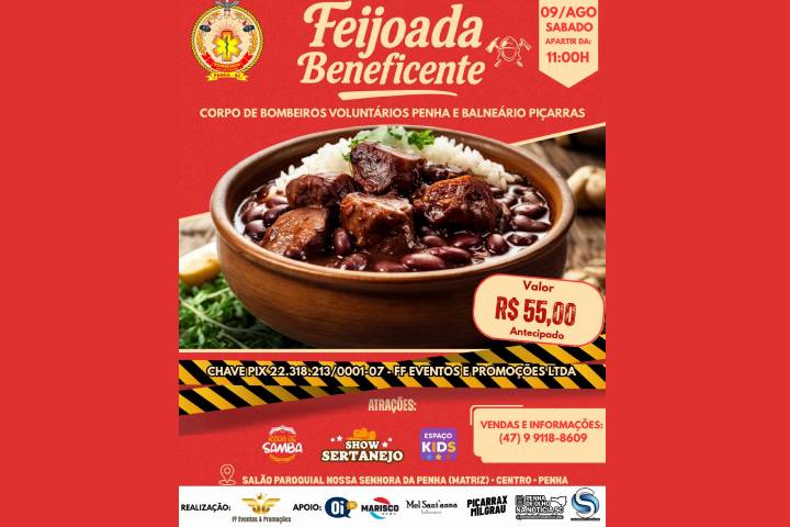 No dia 9 de agosto acontece em Penha a Feijoada Beneficente em prol dos Bombeiros Voluntários de Penha e Balneário Piçarras. O evento será realizado no Salão Paroquial da Igreja Matriz, no centro da cidade, e contará com várias atrações musicais como sertanejo e uma rode de pagode, além de espaço kids e outras atrações.