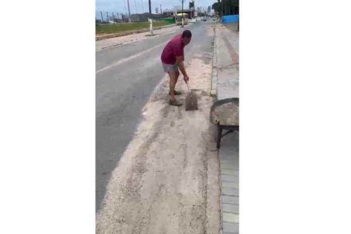 Além do alagamento, o asfalto novo já apresenta danos visíveis. Em alguns pontos, a lama e a areia acumuladas comprometem a circulação de veículos e pedestres.