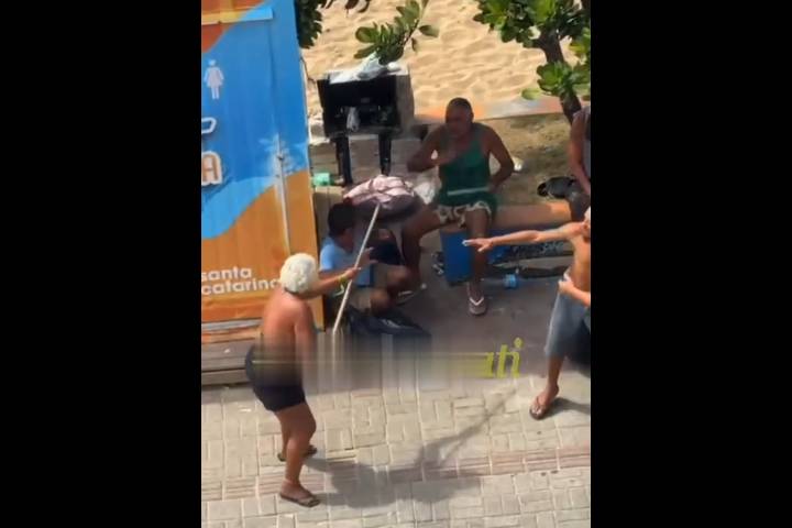 Os moradores que residem na Praia Central registraram um vídeo flagrante, mostrando um grupo de moradores de rua brigando. Uma mulher agride um outro senhor com um cabo de guarda-sol.